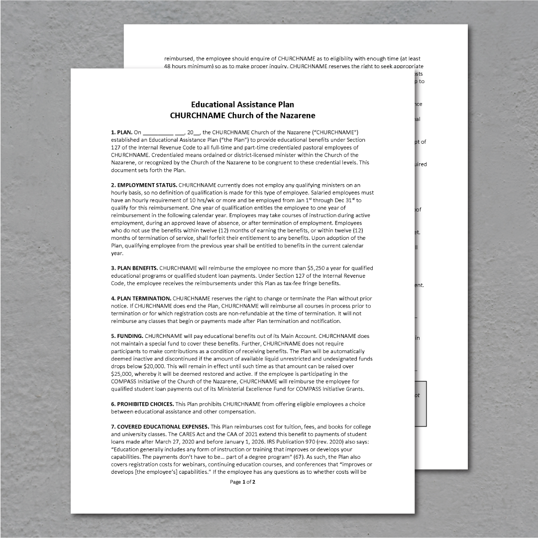 This is a perfect time because the U.S. government has expanded this tax-free benefit of educational assistance for employees to include the repayment of student loans. Up to $5,250 per year may be given to pastors to pay their educational loans, as a tax-free employee benefit. Here is a sample template that your church board could use to establish an Employer Educational Assistance program.